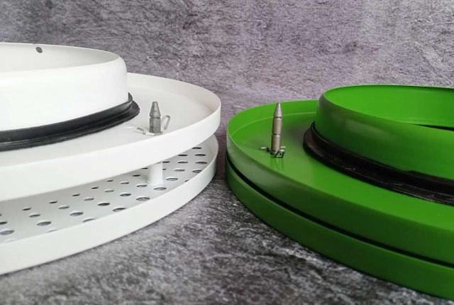 Корпус и рабочие элементы диффузора изготовлены из алюминия или стали с антикоррозийной обработкой — выбор зависит от требований к прочности и условиям эксплуатации. По периметру монтажного фланца предусмотрена виброизолирующая прокладка, которая снижает уровень шума и гасит вибрации от воздуховода.